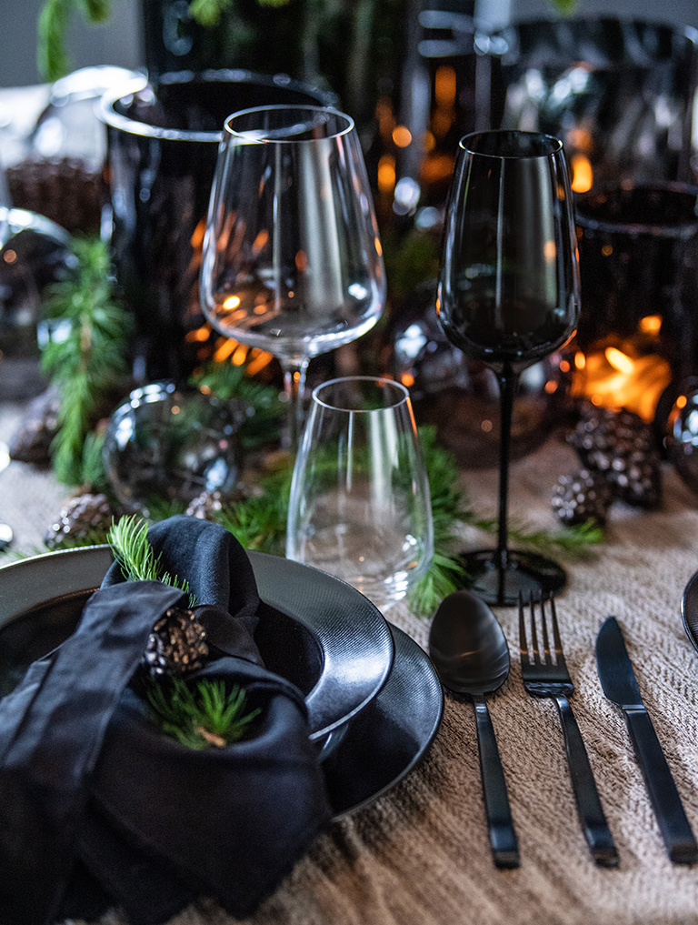 Av blomster velger jeg gjerne hvite og sorte Kahlaer med sorte tøyservietter til nyttårsbordet. Men det aller viktigste for meg er selvfølgelig gjestene, og at de skal få kose seg og ha en festlig kveld. Klokken tolv skåler vi selvfølgelig med sorte NOIR bobleglass og ønsker hverandre «godt nytt år».
