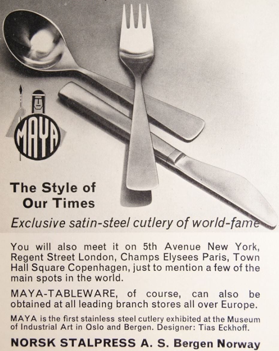 Eckhoff designet Maya i 1960 og er noe av det beste innen norsk designhistorie og har blitt stående som en varig designklassiker. Med sitt svakt triangelformede skaft og sin matte utførelse er den lett gjenkjennelig og nærmest tidløs i sin utforming. Stålet får også en flott patina over tid, og blir bare flottere med tiden.