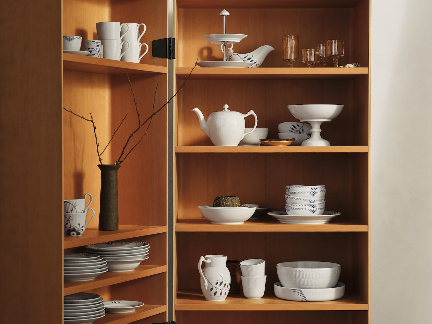 Skapet er fylt med skatter som venter på å bli brukt på nye måter. La dine favoritter få komme frem, og utfolde seg gjennom vakre kombinasjoner som gir bordet personlighet. Kanskje en nyankommen klassiker fra Royal Copenhagen også kan ta plass? Både Sort Mega Riflet og Prinsesse finner du nå hos Tilbords.