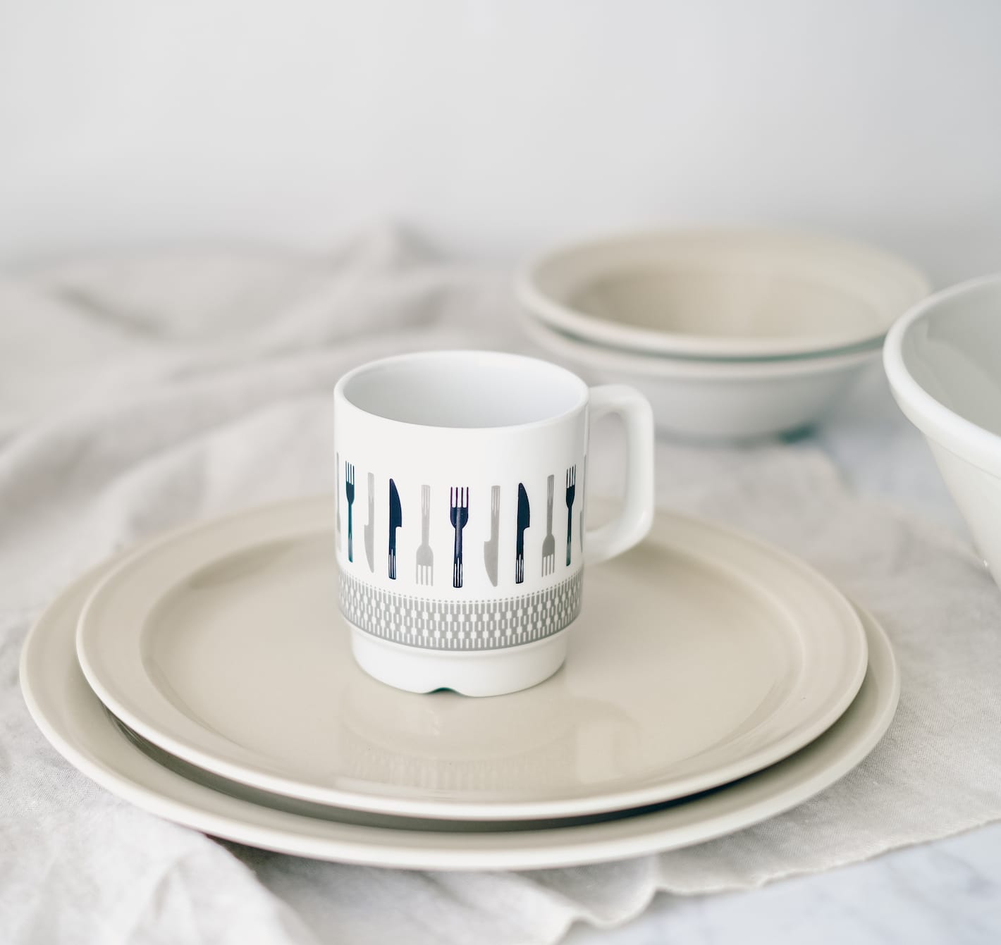 Serviset er en ny utgave av et gammelt design. Hovedformene ble designet av Ragnar Grimsrud på 60-tallet. Serien ble tildelt "Merket for god design" i 1969. Vårt valg falt på dette designet grunnet sin gode funksjonalitet i kombinasjon med tidløst design. Det er rett og slett en klassiker. Det var viktig for oss at tallerkene hadde stor spiseflate og var enkle å stable. Krusene med gode stableegenskaper og hanker som gir godt grep.