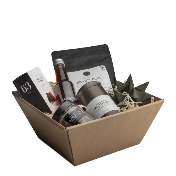 - Silver fog: 100% Arabicakaffe. Nettovekt: 250g Sjokoladetrøfler havsalt:Vegetabilsk fett (kokos), sukker, fettredusert kakaopulver, mysepulver (melk), kakaopulver, havsalt, emulgator (soyalecitin), vaniljearoma. Kan inneholde spor av gluten, peanøtter, nøtter og egg. Nettovekt 100 g. Sjokolademandler: Sukker, mandel, kakaomasse, kakaosmør, helmelkpulver, mysepulver, laktose, yoghurtpulver, yoghurtaroma, soyalecitin, vaniljearoma, overflatebehandlingsmiddel E904, glukosesirup, modifisert tapiokastivelse, kokosolje, rapsolje. Kan inneholde spor av hasselnøtter, cashewnøtter, paranøtter og pekannøtter. Sjokoladen inneholder minst 30% kakaotørrstoff. Nettovekt 130g. Bestmors frukthage: Eplebiter, hyllebær, hibiskusblomster, rødbeter, druer, aroma, bjørnebærblader, solbær, bringebærbiter. Nettovekt: 115g Karamellsirup: Sukker, vann, aroma, glukose, sitronsyre, konserveringsmidler (kaliumsorbat E202 og natriumbenzoat E211). Nettovekt: 250 ml